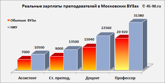 Наш опрос педагогов 15 Московских ВУЗов, как обычных, так и ВУЗов, имеющих статус Национальных исследовательских Университетов (НИУ), таких как МГУ, МФТИ, МИФИ, ВШЭ и другие (там ставки в полтора раза выше, чем в обычных, не имеющих такого статуса), показал следующее