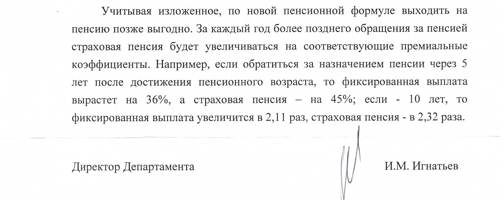 Его реакция на обращение, во-первых, свидетельствует о том, что Председатель комитета вник в суть вопроса и по крайней мере признал, что "указанные стимулирующие меры" не обязывают граждан к каким либо невыгодным действиям и принятие решения должно быть исключительно добровольным. Во-вторых, он перенаправил письмо-запрос в Минтруд РФ - авторам и разработчикам идеи о "выгодности более позднего выхода на пенсию".
